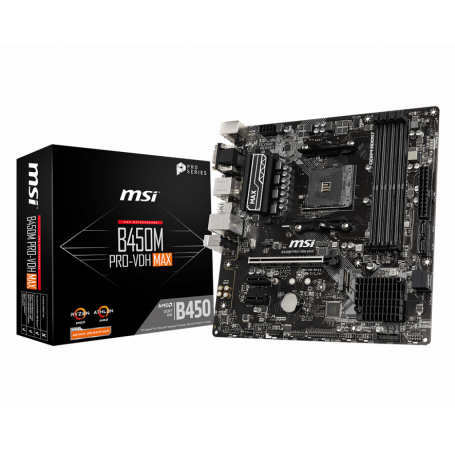 La MSI B450M Pro-VDH Max est une carte mère micro-ATX conçue pour offrir des performances stables et une compatibilité étendue avec les processeurs AMD Ryzen sur socket AM4. Avec son chipset B450, elle est parfaite pour des configurations gaming, bureautiques ou multimédias à petit budget, tout en garantissant des fonctionnalités modernes.