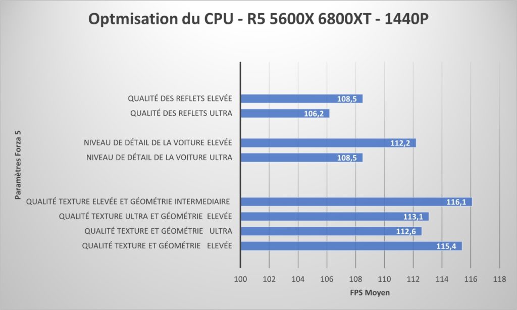 Le moyen le plus simple d’améliorer les performances CPU de Forza Horizon 5 est de jouer sur les paramètres de qualité des textures environnementales et de la géométrie environnementale. Il est également possible de régler le niveau de détails des voitures ou la qualité des reflets pour obtenir une amélioration modérée des FPS. Ci dessous un test en 1440P (résolution intermédiaire) avec les différentes options testées sur un Ryzen 5 5600X et une RX 6800XT